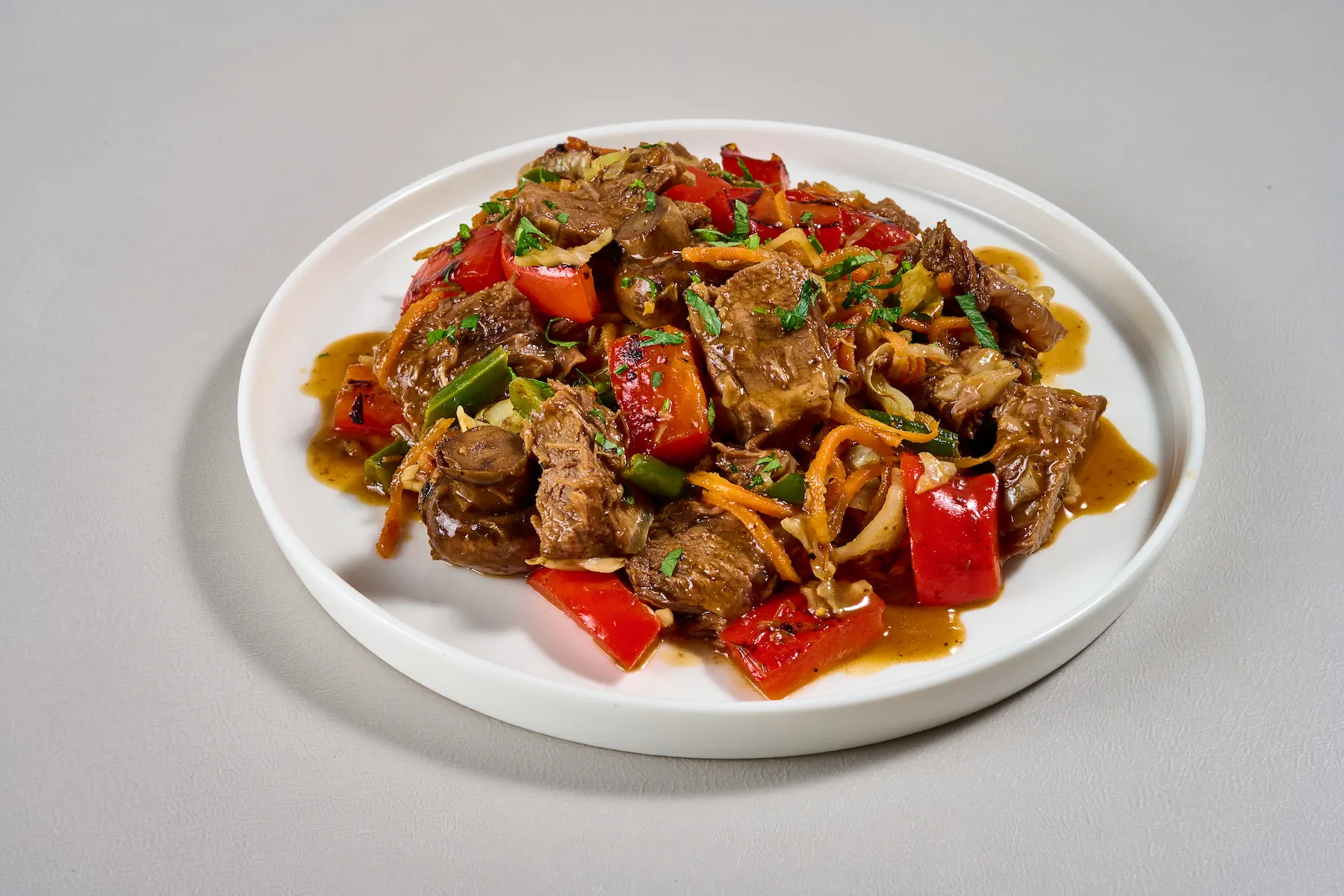 רצועות בקר ברוטב סצ'ואן, איכותי ומוכן בהקפדה במטבח של 'דרך השף'.
